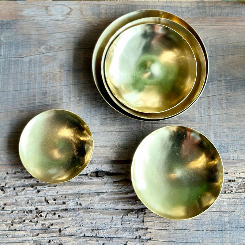 Set de 5 platos de metal color dorado gastado. Combinalo con velas y accesorios para crear un centro de mesa único.